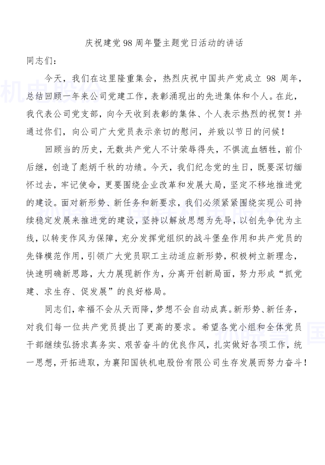 今年是建黨98周年。“七一”前后,襄陽國鐵機電股份有限公司開展了豐富多彩的紀念活動,以傳承紅色基因、弘揚革命精神,不忘初心、牢記使命,矢志為中華民族偉大復(fù)興中國夢努力奮斗。